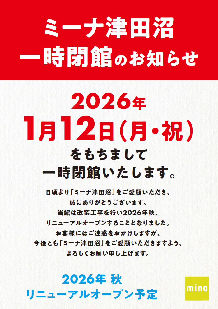 ミーナ津田沼は、2026年1月12日(月・祝)をもちまして一時閉館いたします。